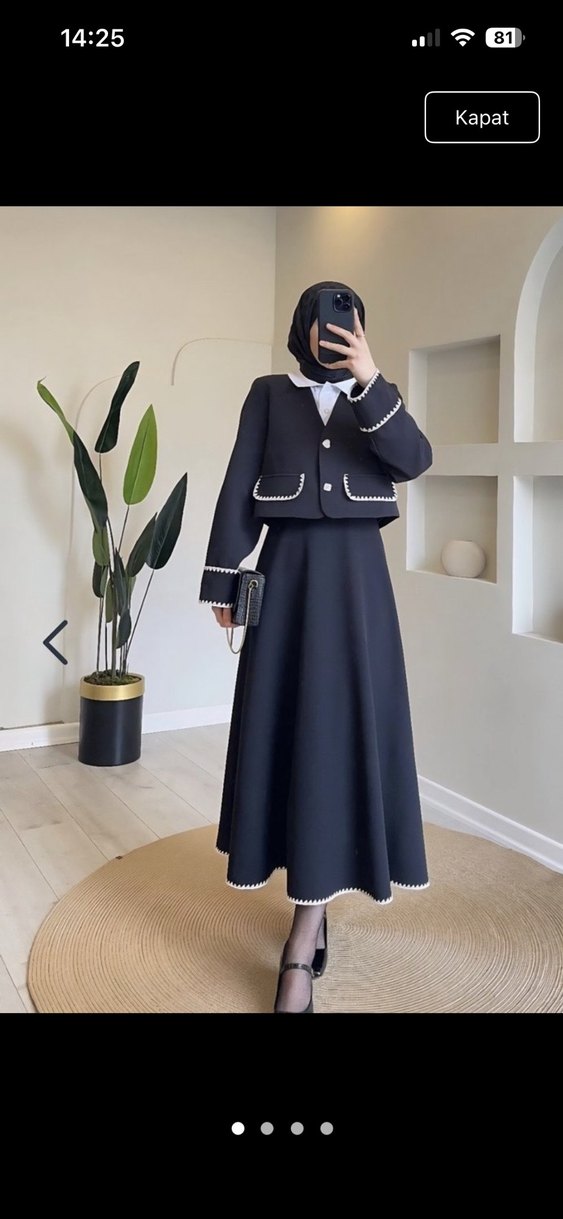 Nakış detaylı, uzun siyah kadın takımı, notched lapel yakalı ve uzun kolludur. Düzgün sentetik kumaştan yapılmış, ofis için uygun modest ve şık bir görünüme sahiptir.