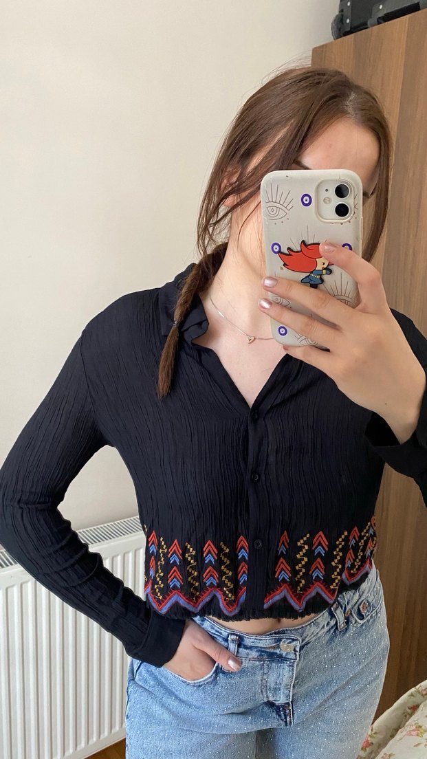 V yakalı, düğmeli, uzun kollu, bol kesim triko bluz. Koyu kumaş üzerinde renkli nakış detayları bulunur, günlük kullanım için uygundur.