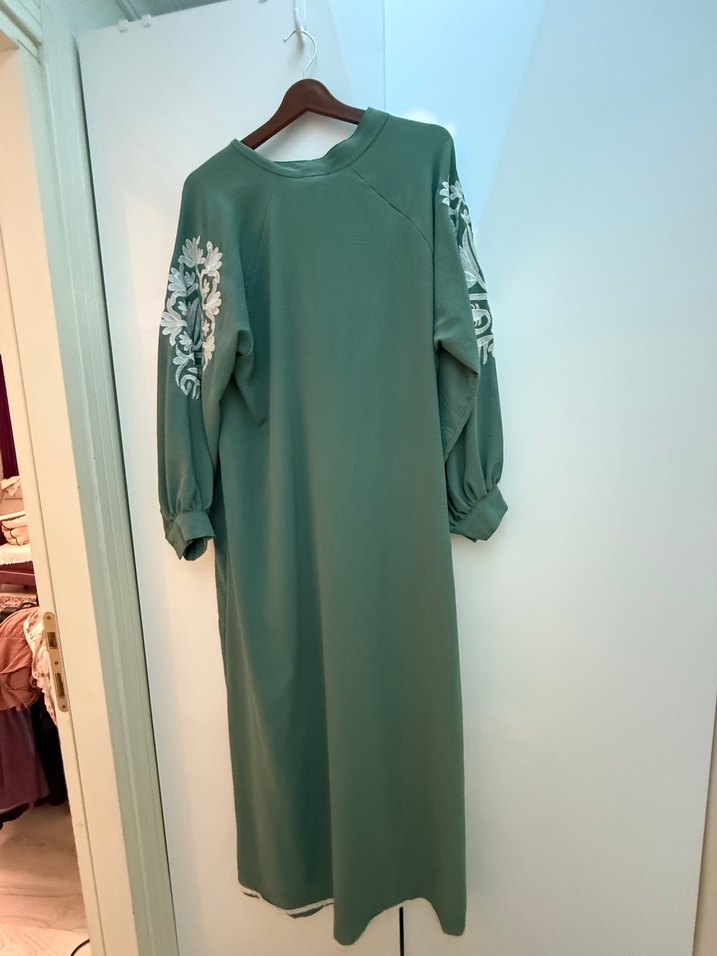 Nakış detaylı uzun kollu, yeşil elbise. Salaş kesim, yuvarlak yaka ve dökümlü tasarıma sahip, günlük kullanıma uygun sentetik kumaş.