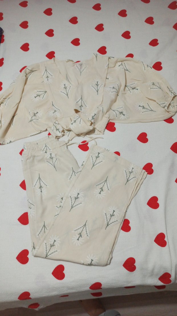 Nakışlı işlemeli balon kollu V yaka, veli lastikli ve baglamalidri alt uzun ve bel lastikli bol paçalıdir.hic kullanilmadi