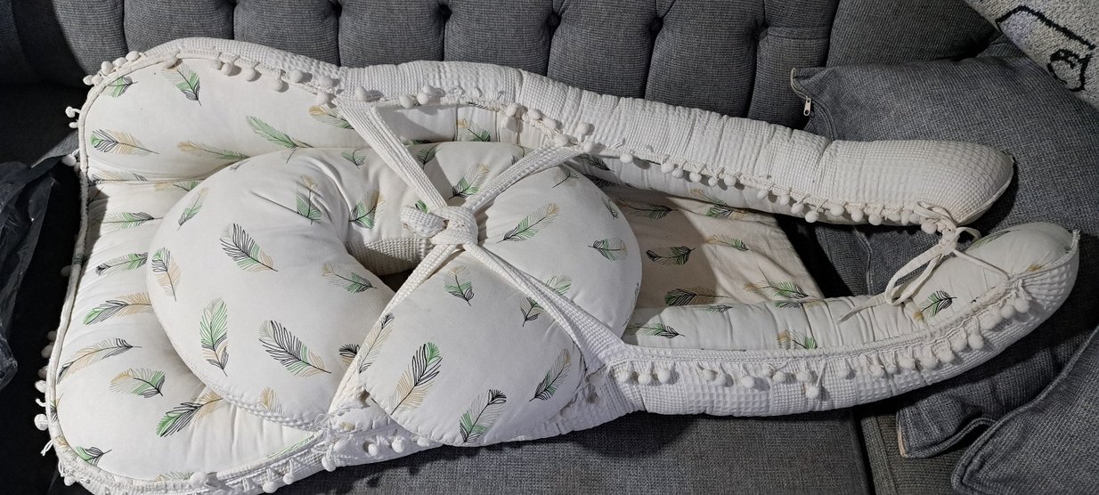 Nakış işlemeli tüy desenleri ve süslü ponponlarla tasarlanmış beyaz bebek uyku seti, yumuşak sentetik kumaştan üretilmiştir.
