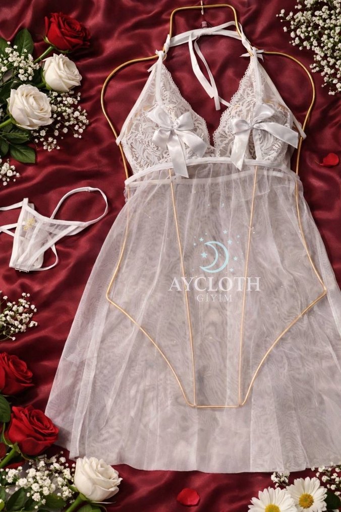 Nakış işlemeli, askılı beyaz mini gecelik, ince ve şeffaf kumaşla tasarlanmıştır. Uyumlu tanga ile birlikte gelir. Marka: AYCLOTH. S/M