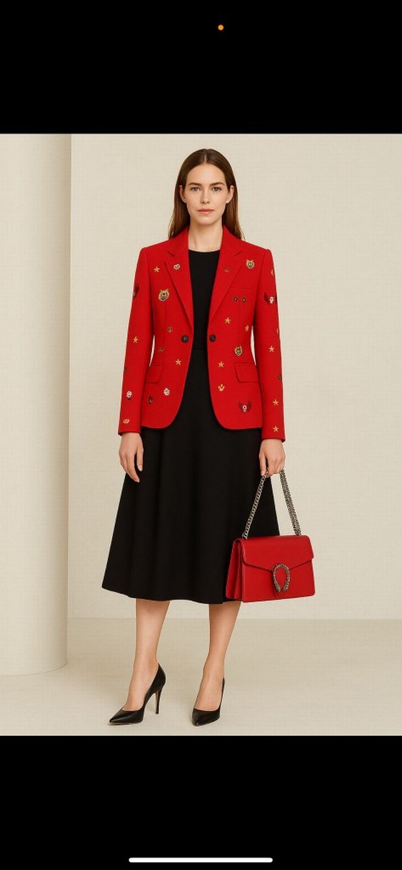 Nakış işlemeli kırmızı blazer ceket, normal boy ve düğmeli detaylara sahiptir. çok şık ve kaliteli resmen Gucci kalitesi diyebilirim.kol uclari ve yaka uçlarında reng solması vardır giyildiginde belli olmuyor