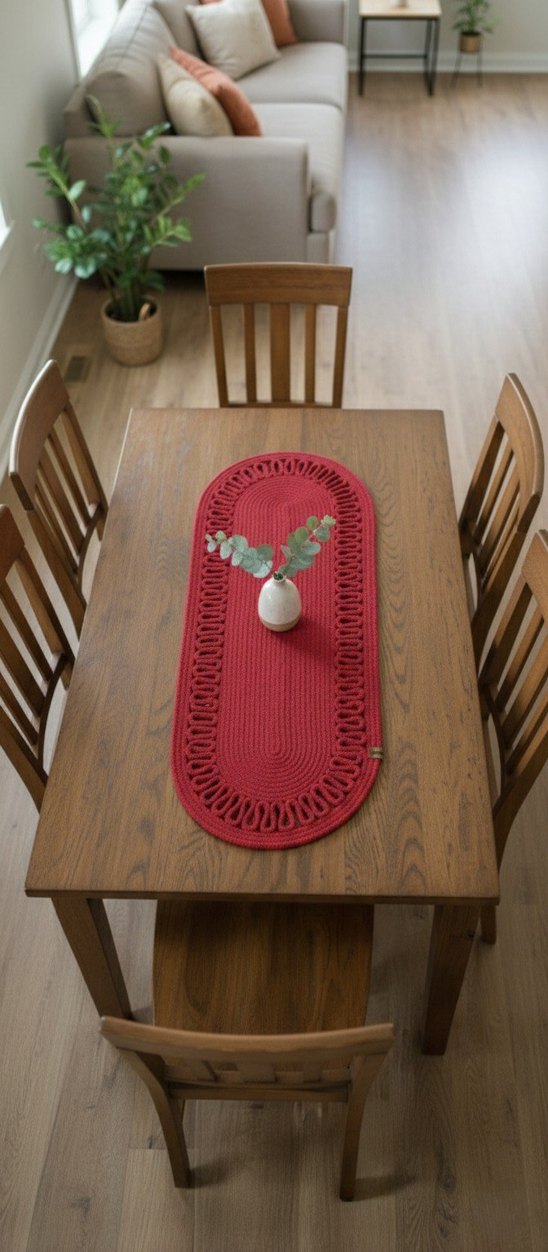 Nakış işlemeli renkli desenlere sahip kırmızı runner canlılık katar. Detaylı işlemeleri estetik görünüm sağlar.
