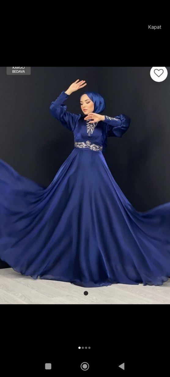 Lacivert uzun abiye elbise, yüksek yaka ve uzun kollu. Bol kesim ve drapeli kumaş ile nakış işlemeleri bulunur. Düğünler için uygundur.