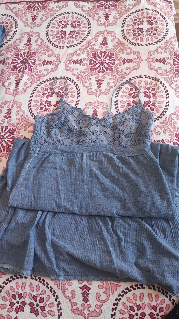 Uzun, askılı, nakış işlemeli mavi elbise bol kesim ve ince askılarla rahat kullanım sunar.