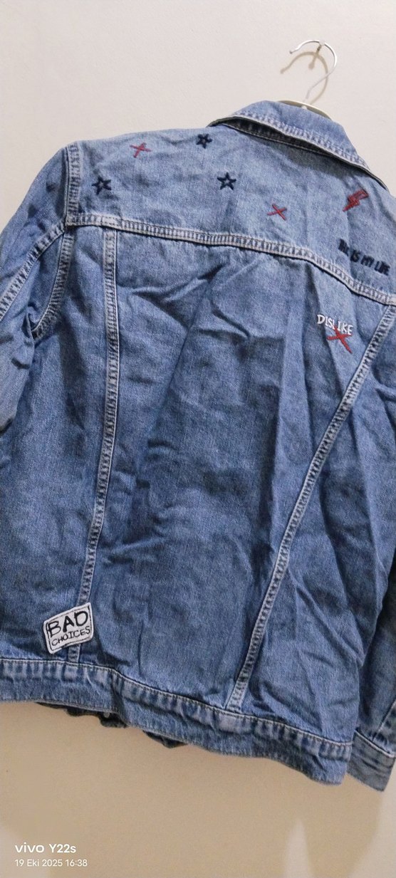 Nakış işlemeli, düğmeli önlü, notalı yaka ve askılı kollu rahat kesim mavi denim ceket.