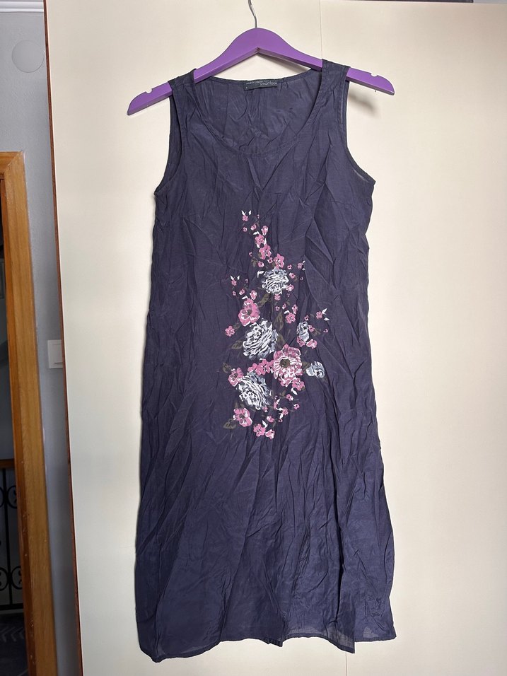 Mudo Tertemiz elbise Mor renkli kolsuz midi elbise, nakış işlemeli çiçek desenleri ve V yakasıyla bohem tarzda, bol kesim rahat bir modeldir.