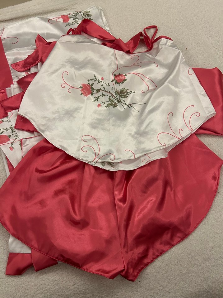 Nakış işlemeli, parlak pembe kumaştan yapılmış, bol kesim kadın gecelik takımı. Kolsuz, klasik tasarımlı ve midi boyda, vintage tarzda. 5 parça ürün, çeyizim için alınmış bedeni l beden hiç giyilmedi