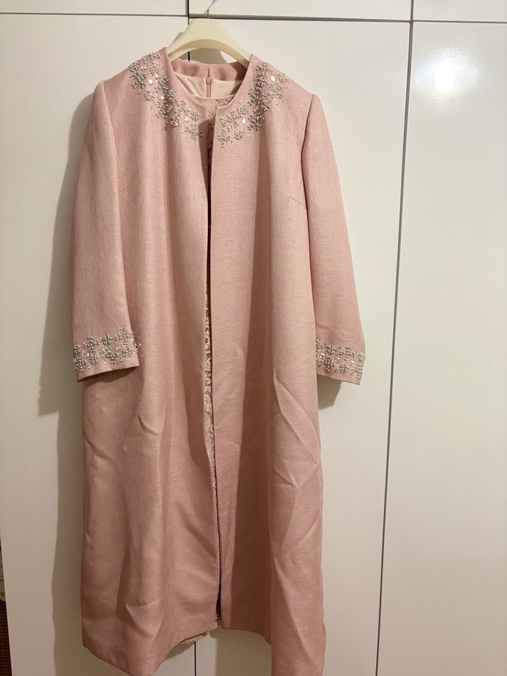 Nakış işlemeli yakası ve manşetleri olan, keten kumaştan yapılmış, uzun ve pembe pastel renkte. Tesettür abiye 1. Kez giyildi