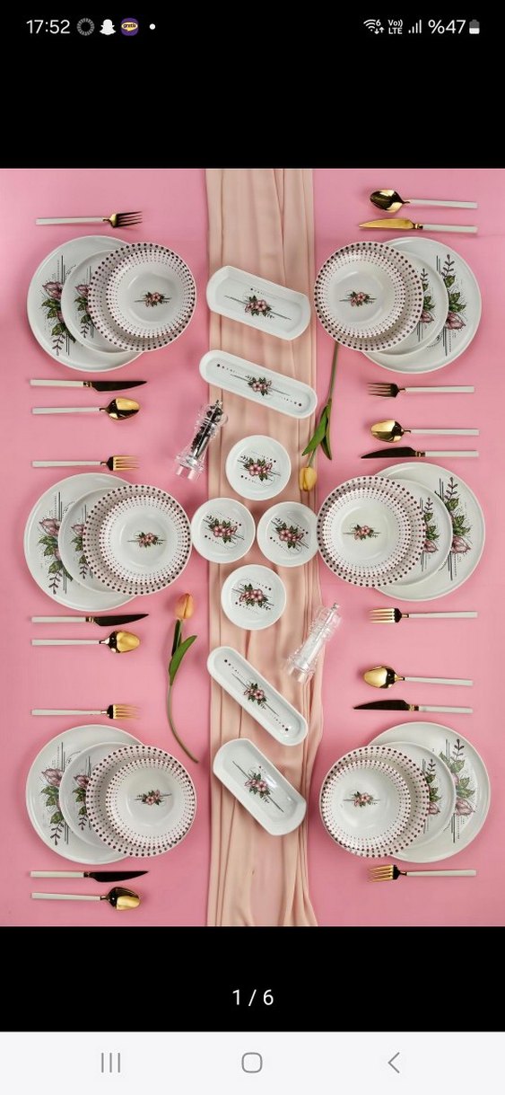 Nakış işlemeli çiçek desenli beyaz tabak ve kaselerden oluşan pastel pembe yemek takımı, altın tonlu çatal bıçak seti ile tamamlanmıştır. ️