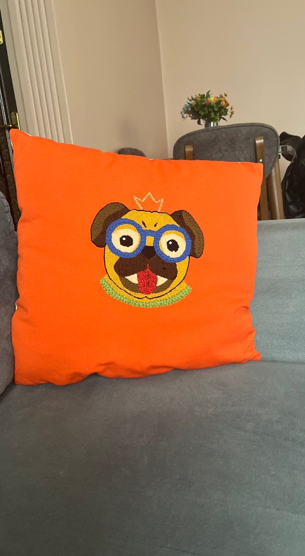 Renkli nakışlı, punch gözlüklü taçlı köpek figürlü turuncu yastık. Duck kumaş istediğiniz ebatta uygulanır.. istenilen çizgi film veya resim siz isteyin gerisi gelsin 10 gün içinde teslim