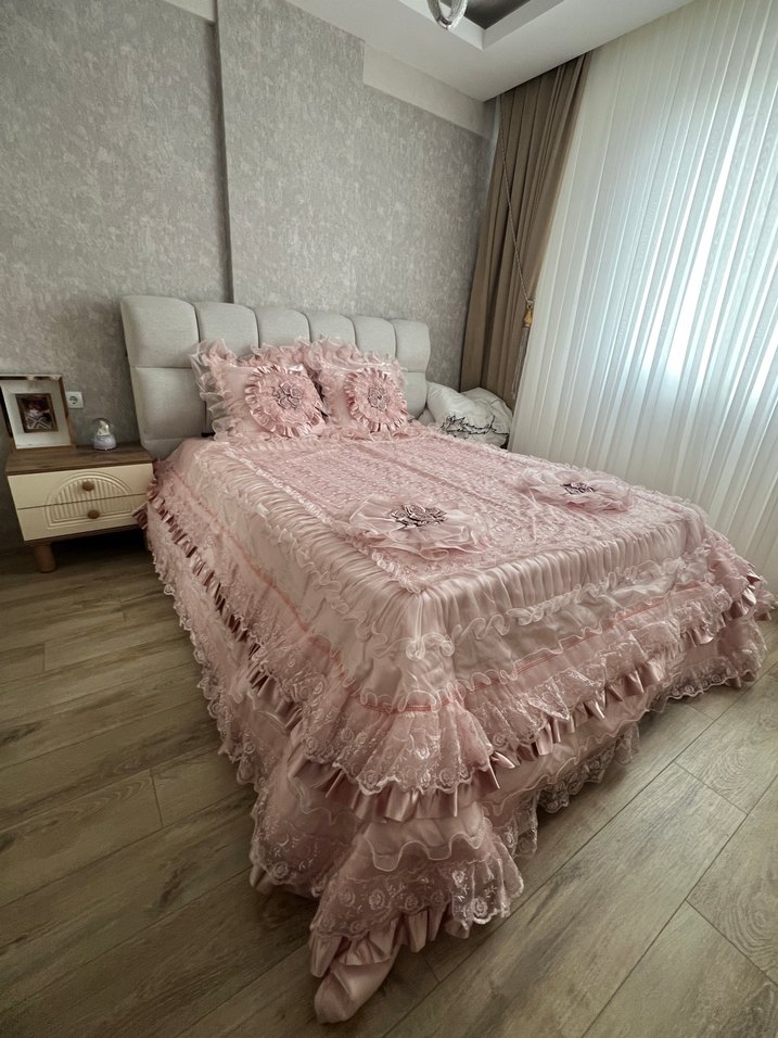 Nakışlı detaylara ve fırfırlı kenarlara sahip pastel pembe yatak örtüsü, uyumlu dekoratif yastıklarla birlikte. Ceyiz icin alindi hic kullanmadim