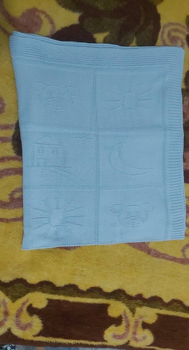 Nakışlı desenlere sahip, yumuşak ve sıcak kumaştan yapılmış açık mavi bebek battaniyesi. Hayvan, güneş, ay ve ev desenleri içerir.