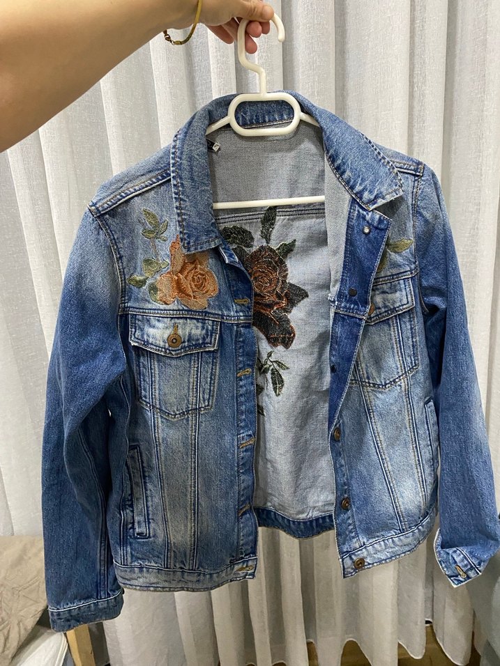 Nakışlı çiçek detaylı açık mavi denim ceket. Notlu yaka, düğmeli, bol kesim ve uzun kolludur. Günlük rahat kullanıma uygun.