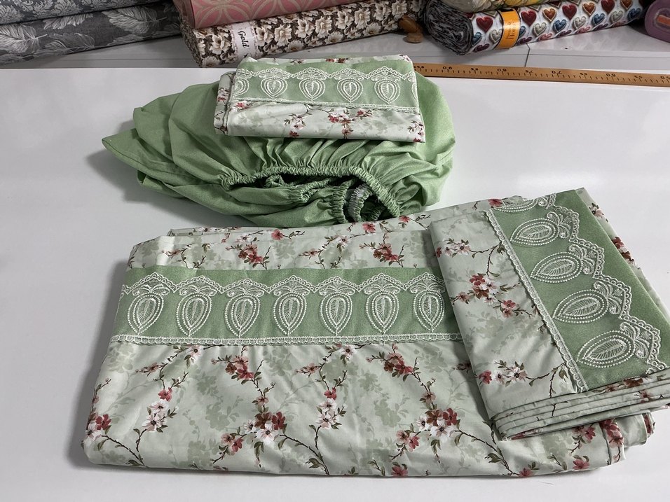 Nakışlı desenlere ve çiçek motiflerine sahip açık yeşil nevresim ve çarşaf takımı. Lastikli çarşaflar kolay kullanım sağlar. Dilediğiniz ölçüde. Dilediğiniz şekilde dikim yapılabilir. Deco marka %100 pamuk kumaştır. Asla solma yapmaz