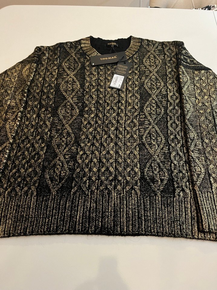 Bu kadın kazağı, bol kesim, uzun kollu ve yuvarlak yakalıdır. Örgü kumaştan yapılmış, nakışlı desenli ve koyu altın renktedir, rahat sokak stili için uygundur.