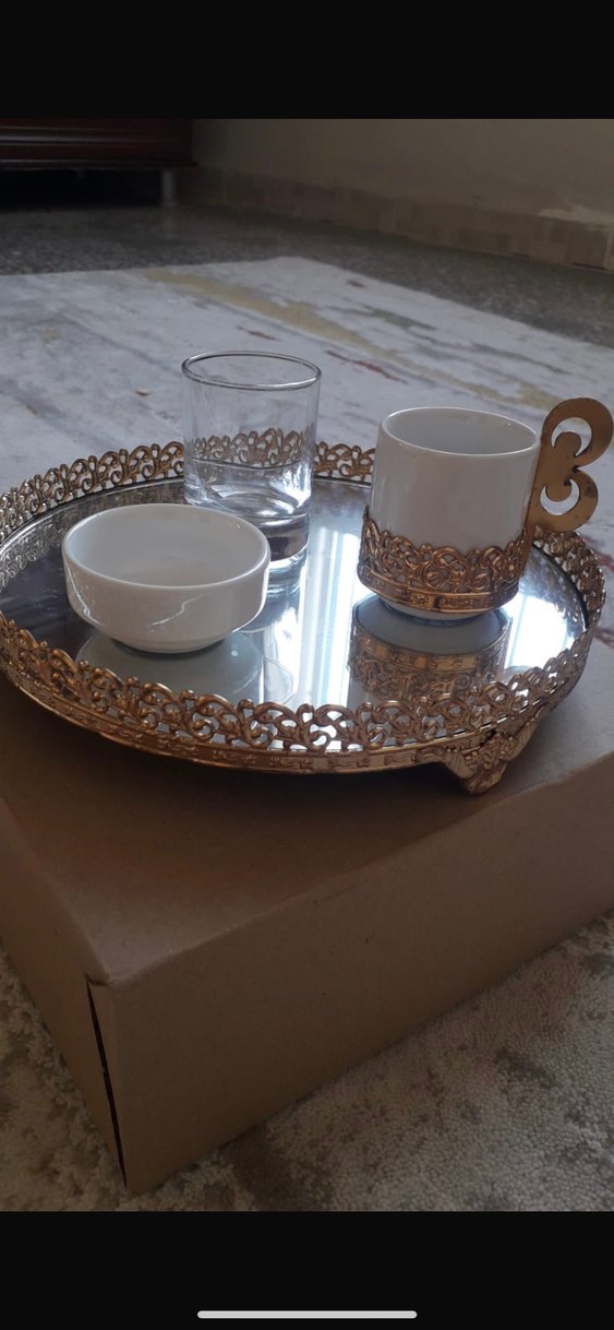 Nakışlı desenlere sahip parlak altın renkli tepsi, altın saplı beyaz fincan, küçük kase ve bardaktan oluşan set. ☕