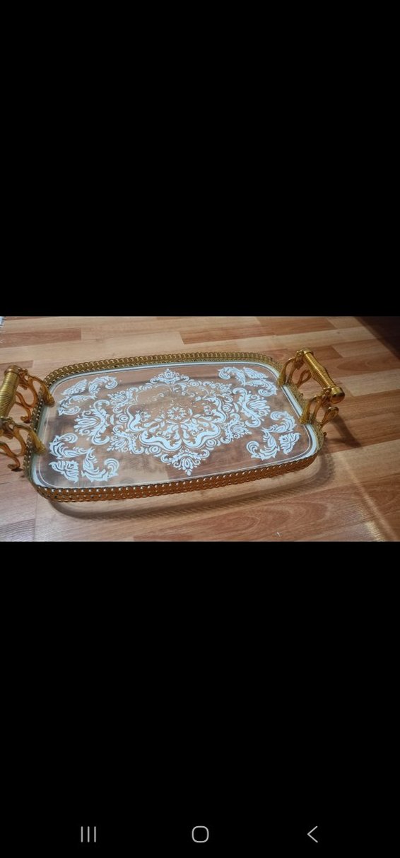 Parlak altın renkte, nakış desenli vintage tarzında, taşıma kulplu tepsi.