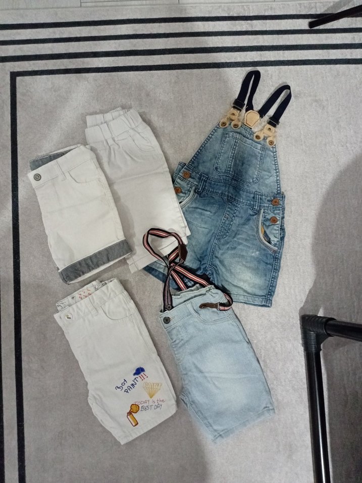Askılı, tokalı gri denim erkek çocuk tulumu ve beyaz, manşetli nakışlı pantolonlar. Rahat ve salaş kesim. sadece fotoğraf çekimlerinde 1 er kez giyildi