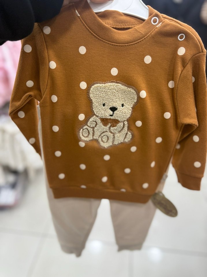 Nakışlı ayıcık ve puantiyeli, kahverengi uzun kollu, yuvarlak yaka bebek takımı. Yumuşak ve sıcak dokulu, örme kumaştan yapılmıştır.