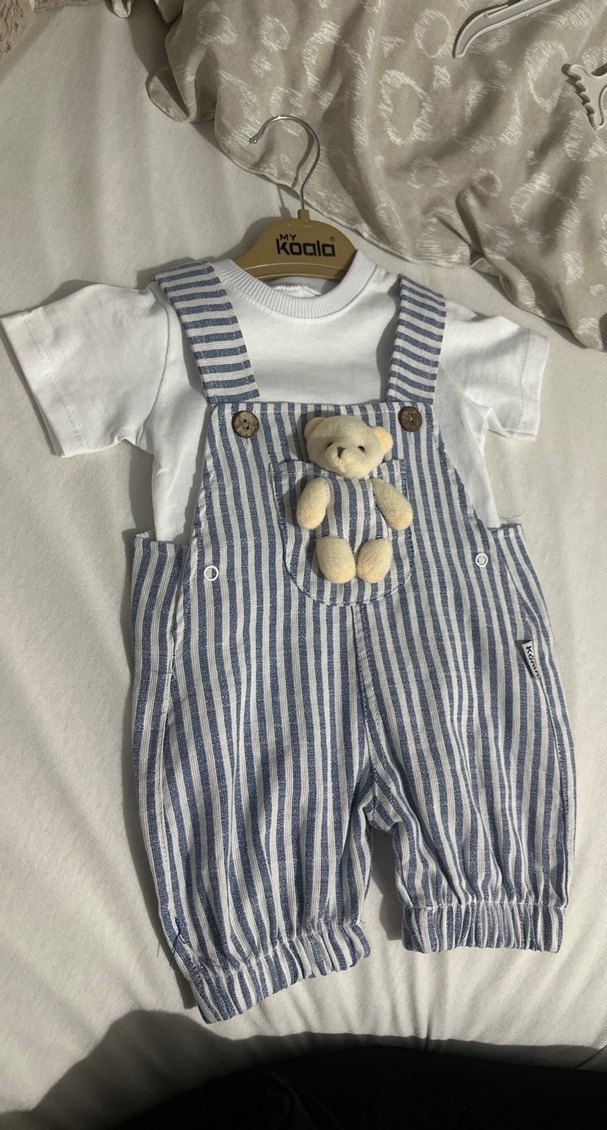Pamuklu kısa kollu beyaz tişört ve nakışlı ayıcık detaylı gri çizgili örme tulumdan oluşan bebek takımı.