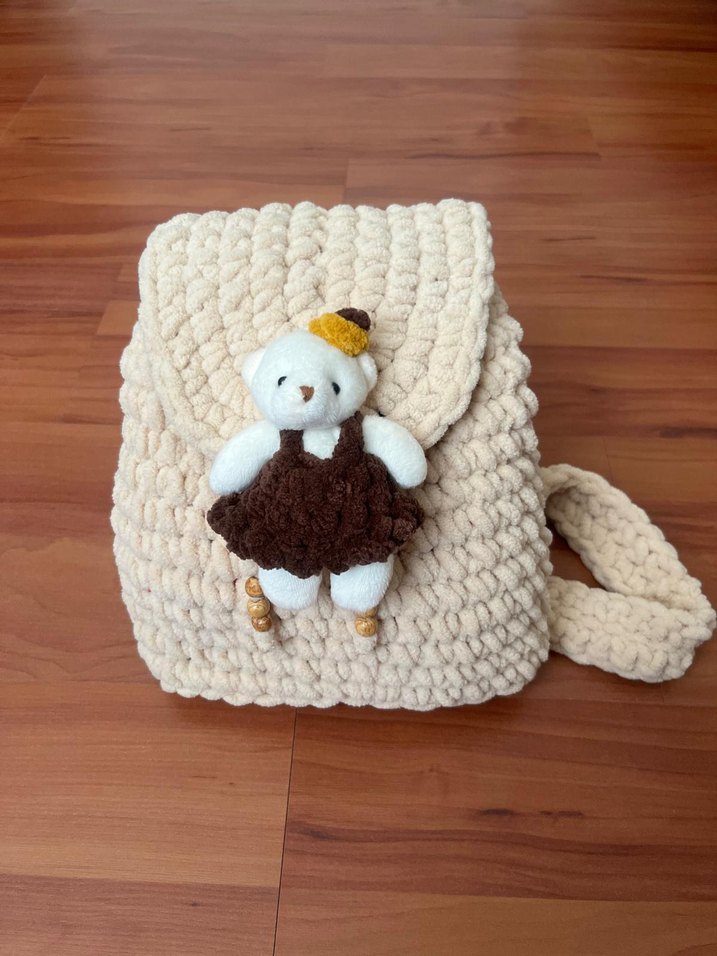 Minik ilmekler markalı,Yumuşak örgü dokulu, önünde nakışlı ayıcık süsü bulunan bej bebek çantası. Kapaklı ve örgü askılıdır.