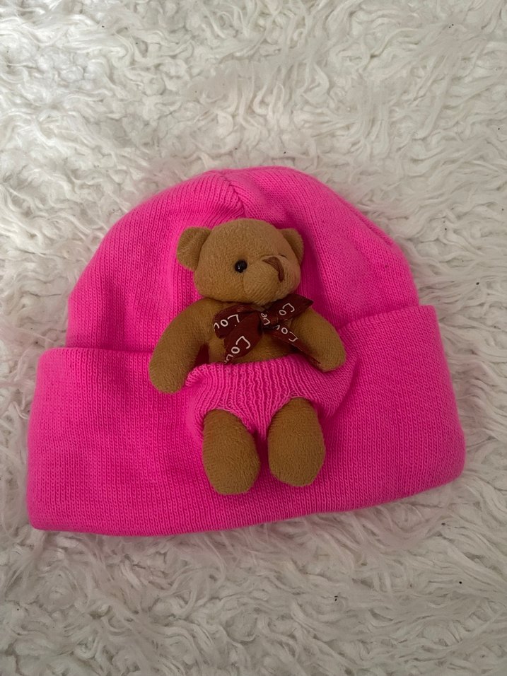 Pembe renkli, yumuşak polar astarlı, nakışlı ayıcık detaylı çocuk bere. Sokak tarzına uygun, örgü yapıda bir model.