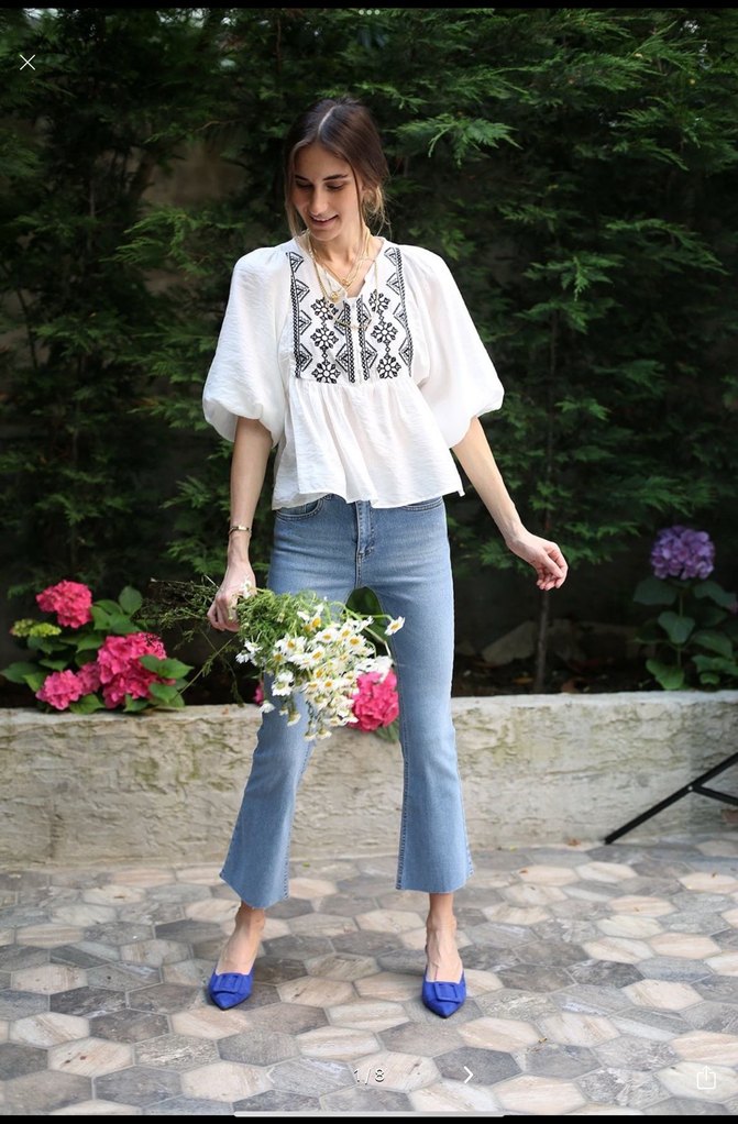 V yaka, balon kollu, volanlı, nakışlı ve detaylı, bol kesim,konforlu rahat, beyaz bohem tarzda bluz. İki koltuk arası 63+63= 126cm dir. Boy:58cm İyi durumdadır sökük yırtık yoktur. 5in1 Can Polat mağazasından almıştım. Markası : Cream& Rouge. Ön kısımda koltuk altlarına doğru çok hafif sararma vardır. Belki yıkanınca çıkabilir bu durumun fotoğrafını son fotoğraf olarak yükledim. Bu yüzden fiyatı biraz kırdım. #5in1canpolat #nişantaşı #canpolat #bluz #pamuk #nakış #etnik #desen #müslin #pamuklu #nakışlı #koton #lcw #zara #bershka #stravarius #takip #beğeni #dolap #beyaz #şilebezi
