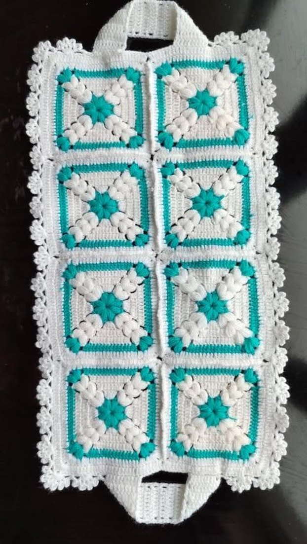 Nakışlı kare desenlere sahip açık turkuaz ve beyaz renklerde örme çocuk örtüsü, yumuşak ve dekoratif bir dokunuş sunar.