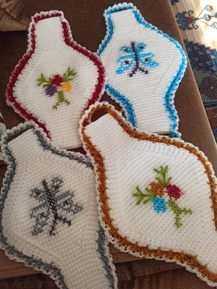 Çeşitli çiçek ve soyut desenlerle işlenmiş, çok renkli ve açık tonlarda banyo lifleri