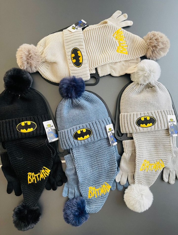 Nakışlı Batman logolu, ponponlu örgü bere ve eldiven setleri. Farklı renk seçenekleriyle trend sokak stili için uygundur.