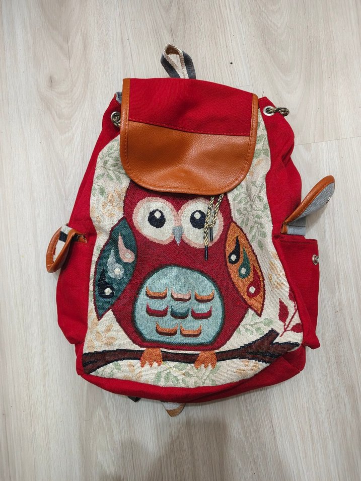 Nakışlı baykuş desenli, tokalı kapaklı kırmızı sentetik kumaş bohem sırt çantası. Günlük kullanıma uygun.