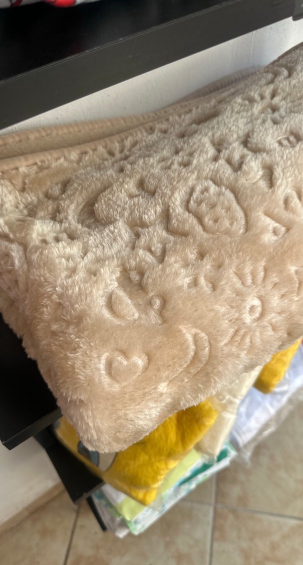 Pastel bej renkte, yumuşak dokulu nakışlı çocuk battaniyesi, rahat ve nazik bir dokunuş sağlar.