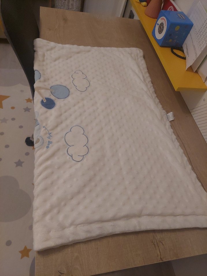 Yumuşak beyaz çocuk battaniyesi, pastel tonlarda nakışlı bulut ve balon desenleriyle rahatlık sağlar.