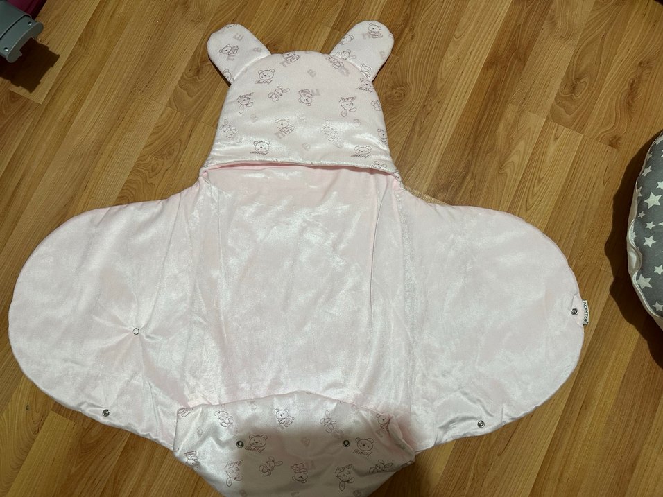 Nakışlı ayıcık desenli, kapüşonlu ve yumuşak sentetik kumaştan yapılmış pastel pembe çocuk battaniyesi.