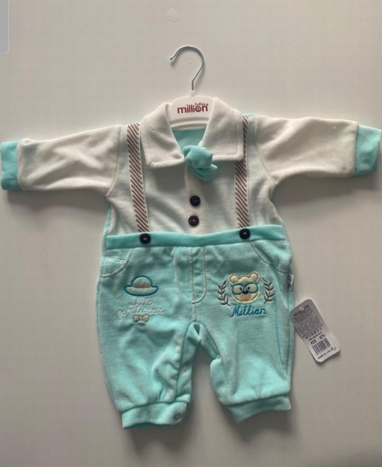 Uzun kollu, düğmeli ve yakalı bu bebek erkek tulumu yumuşak ve sıcak kadife kumaştan yapılmıştır.