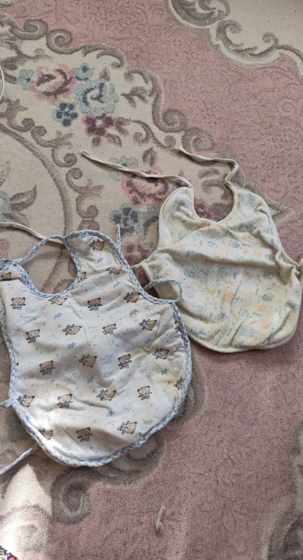 Nakışlı desenlere sahip, pastel tonlarda iki beyaz bebek önlüğü seti. Biri küçük hayvan figürlü, diğeri hafif çiçek nakışlıdır. Boyun bağlamalıdır. ikili fiyat
