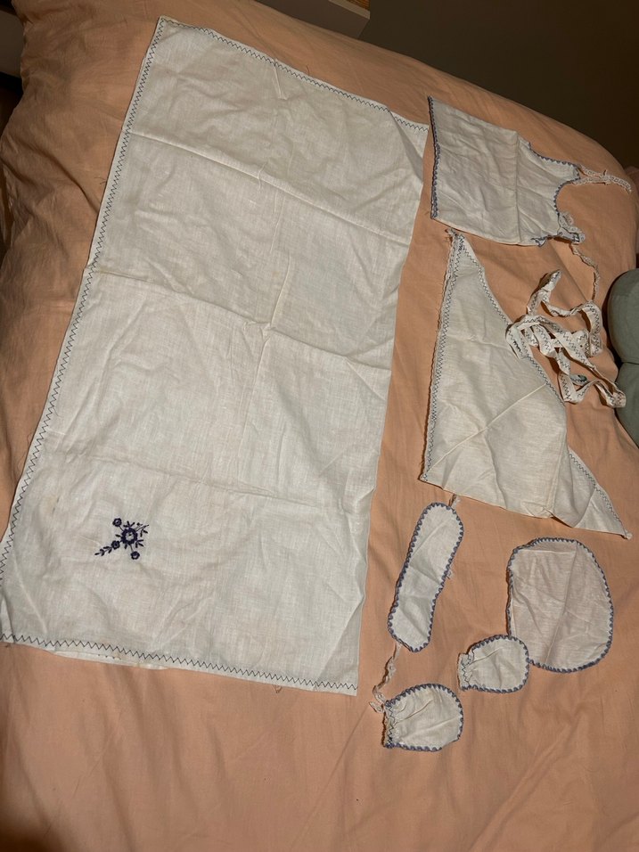 Bej renkte, mavi nakış detaylı bebek seti, farklı parçalar ve karşı kültür tarzı içerir. Toplamda bir çift eldiven bir adet göz bandı bir adet yuvarlak ağız örtüsü bir adet üçgen örtü 75e 30 bir adet normal örtü 75x75 bir adet atlet 25 boy bağlamalı olduğundan uzayıp kısaltabilirsiniz boyu en ise 20 ince kumaştır keten ile müslin arası bir kumaştır.