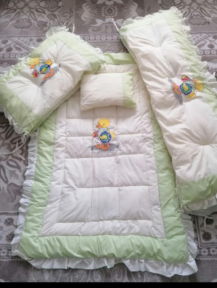 Nakışlı ördek desenli yumuşak ve sıcak kumaştan yapılmış beyaz ve pastel yeşil renklerde bebek uyku seti. Yastık, uyku tulumu ve yatak örtüsü içerir. ️