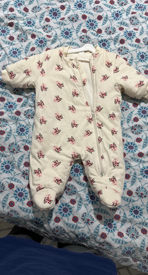 Nakışlı desenlere sahip beyaz bebek uyku tulumu, kolay giyimi sağlayan fermuarlı tasarıma sahiptir. Askısız yakalı ve pastel tonludur.