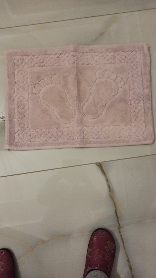 Yumuşak bej pastel tonlarda, nakışlı ayak desenlerine sahip banyo paspası, banyonuza zarif bir dokunuş katar.