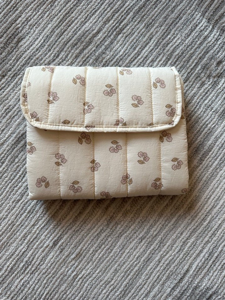 Nakışlı çiçek desenleri ve yumuşak kapitone dokusuyla pastel tonlarda bej bebek çantası.