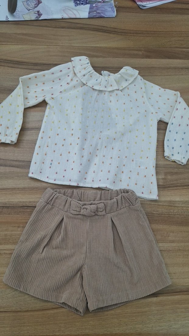 Bej renkli, düğmeli uzun kollu nakışlı üst ve fiyonk detaylı şortlu bebek kız takımı. Rahat ve şık. Yeni gibi