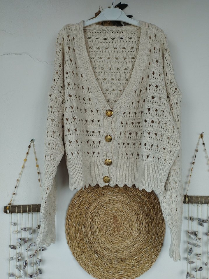 Bej renkli, nakışlı, uzun kollu, bol kesim, kısa uzunlukta, rahat bohem tarzında örme kadın hırka. Günlük kullanıma uygundur.