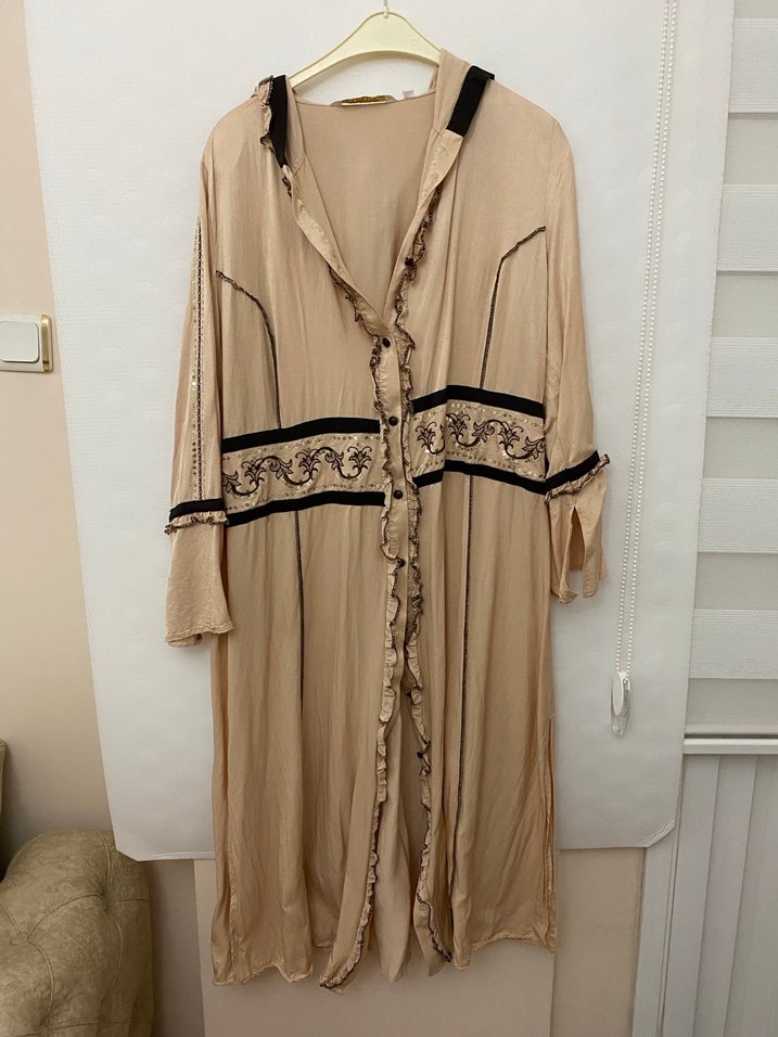 Bohem tarzda, uzun kol ve bol kesime sahip, pastel bej renkte nakışlı kadın uzun elbise. Rahat ve şık bir görünüm sunar.
