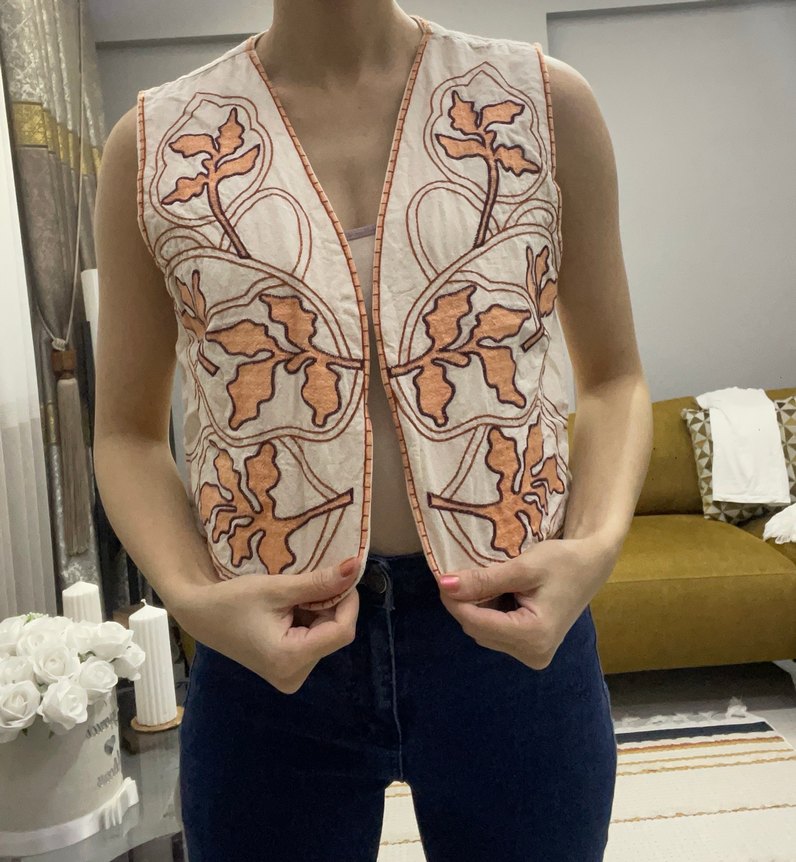 Nakışlı çiçek desenli, V yaka, kolsuz bej bohem yelek. Düğmeli ve normal kesim, günlük kullanıma uygun.
