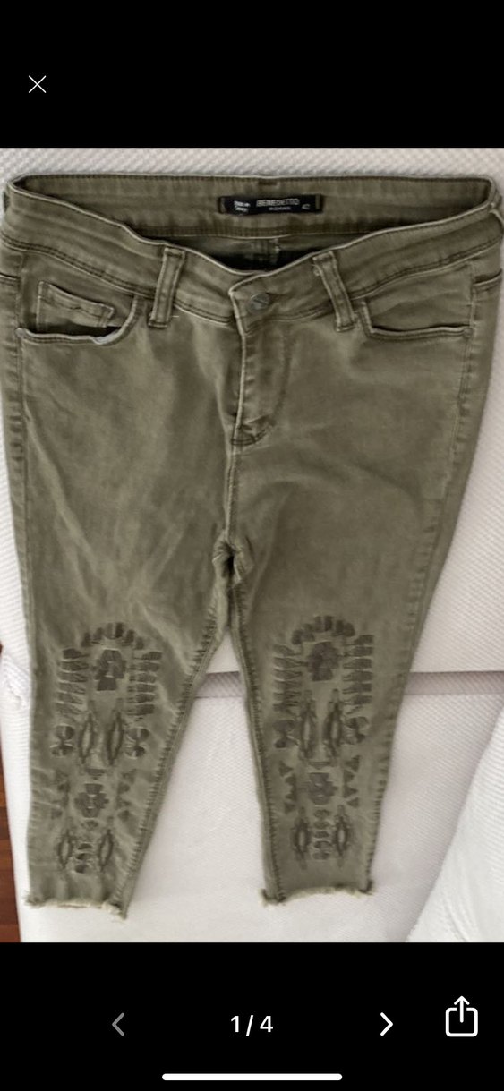 Hakirenkli, düğmeli ve nakışlı detaylara sahip ful likralı vucudu saran kot pantolon. Midi boyda, bohem tarzda, günlük kullanıma uygun. Beden 42 yazıyor fakat 36/40 arasına daha rahat olur