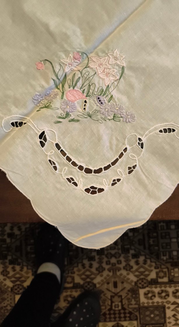 Bej renkte, pastel tonlarda nakışlı çiçek desenlerine sahip bohem tarzda masa örtüsü. Kumaşında zarif kesme işlemeleri ve yumuşak dokular bulunur.