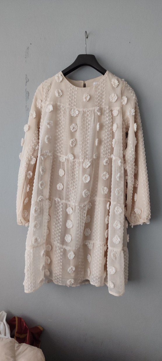 Bej renkte, uzun kollu, yuvarlak yakalı, nakışlı ve fırfırlı detaylara sahip bohem mini elbise. Rahat kalıp ve midi boy ile günlük kullanıma uygundur.